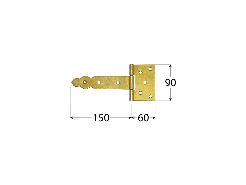 Povrchová úprava žlutý galvanický zinek. Upevnění pomocí vrutu do dřeva ⌀6; počet děr 6 a vratového šroubu M6; počet děr 2